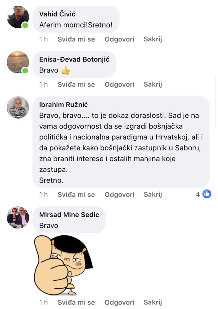 “Jedno veliko bravo i puno sreće u ostvarenju cilja”, “Hvala Bogu, tako i treba”, “Aferim”, “Bravo, sad sigurno izlazim na izbore jer napokon imam za koga glasati” samo su neki od komentara oduševljenih Bošnjaka.