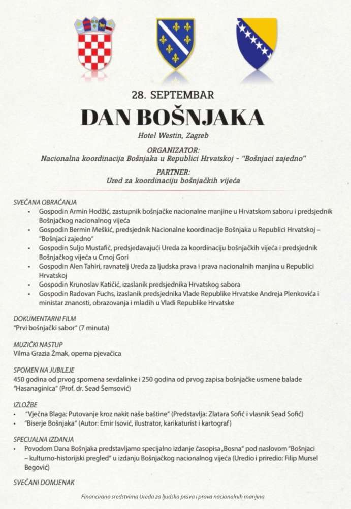 Nacionalna koordinacija Bošnjaka u Republici Hrvatskoj „Bošnjaci zajedno“, uz saborskog zastupnika bošnjačke, albanske, crnogorske, makedonske i slovenske nacionalne manjine u Hrvatskom saboru Armina Hodžića, te partnera Ureda za kordinaciju bošnjačkih vijeća u subotu će održati centralnu manifestaciju obilježavanja 28. septembra – Dana Bošnjaka, u Zagrebu, Hotel Westin, u 17 sati. Svečanost se održava pod pokroviteljstvom Ureda za ljudska prava i prava nacionalnih manjina u Republici Hrvatskoj.