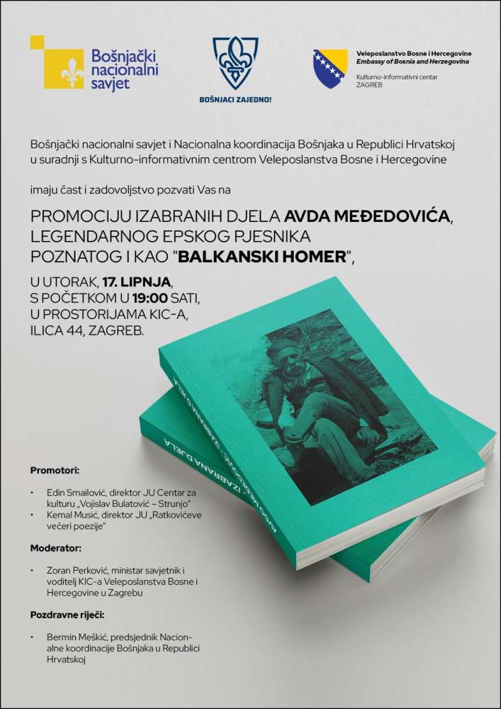 Bošnjački nacionalni savjet i Nacionalna koordinacija Bošnjaka u Republici Hrvatskoj, u saradnji s Kulturno-informativnim centrom Veleposlanstva Bosne i Hercegovine, organiziraju svečanu promociju izabranih djela bošnjačkog epskog pjesnika Avde Međedovića, poznatog širom svijeta i kao “Balkanski Homer”.