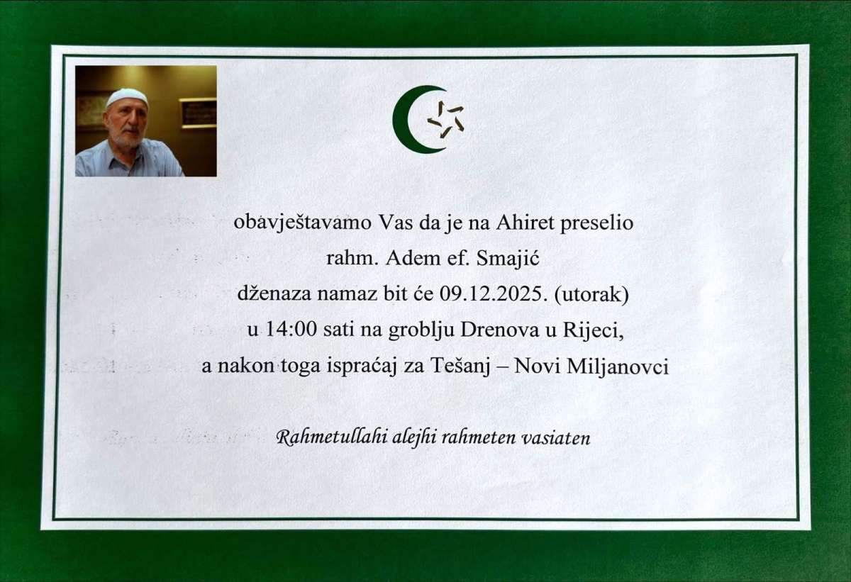 Dženaza namaz će se klanjati u utorak, 09.12.2025. u 14:00 sati na groblju Drenova u Rijeci, nakon čega će biti upriličen ispraćaj za Tešanj – Novi Miljanovci, gdje će Adem ef. Smajić biti spušten u zemlju svojih predaka.