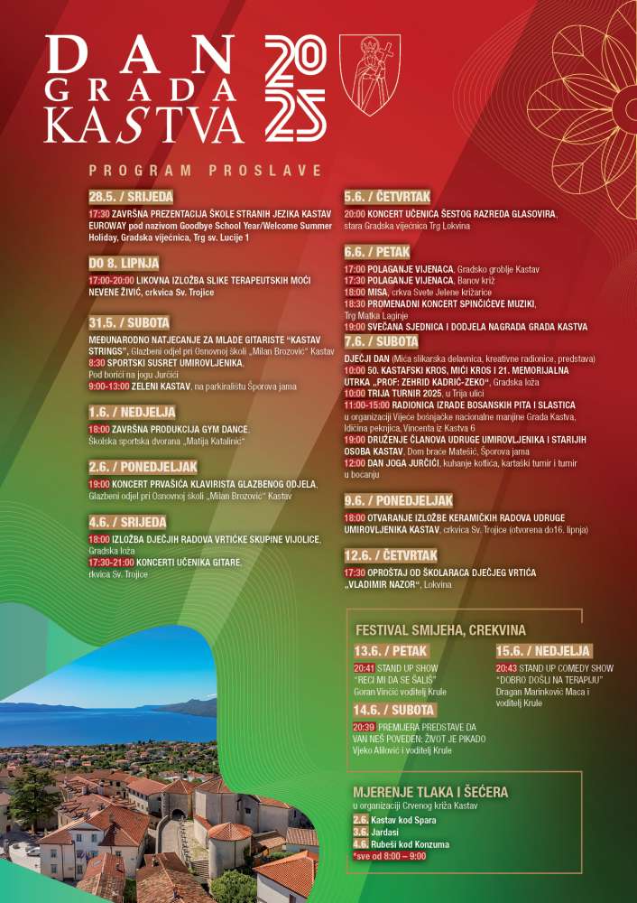 Program obilježavanja Dana grada Kastva trajat će sve do sredine juna s mnogobrojnim kulturnim, zabavnim i sportskim manifestacijama. U program obilježavanja uključile su se brojne kastavske udruge tako da će svatko pronaći nešto za sebe. Uključene su Udruga umirovljenika i starijih osoba, Društvo naša djeca Kastav, kastavska škola i glazbeni odjel, dječji vrtić, Crveni križ, udruga Zeleni Kastav, škola Euroway i Vijeće bošnjačke manjine grada Kastva.