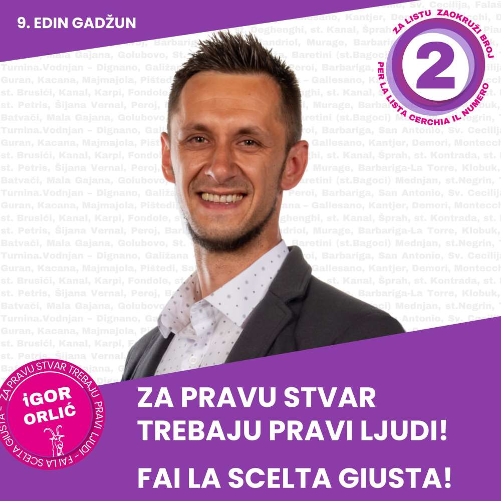 Edin Gadžun, predsjednik Vijeća bošnjačke nacionalne manjine u Vodnjanu i dugogodišnji borac za ravnopravnost i institucionalno učešće manjina, na predstojećim izborima kandidira na listi IDS-a u sklopu kampanje Igora Orlića za gradonačelnika. Njegov angažman dolazi kao prirodni nastavak dosadašnjeg rada u zajednici, ali i kao korak naprijed prema, kako sam ističe, „konkretnijem, poštenijem i uključivijem Vodnjanu“.