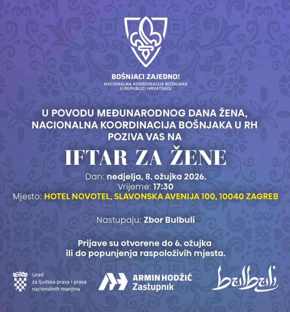 Nacionalna koordinacija Bošnjaka u Republici Hrvatskoj povodom Međunarodnog dana žena organizira iftar za žene, koji će se održati u nedjelju, 8. marta 2026. godine, s početkom u 17:30 sati, u hotelu Novotel, Slavonska avenija 100, Zagreb.
