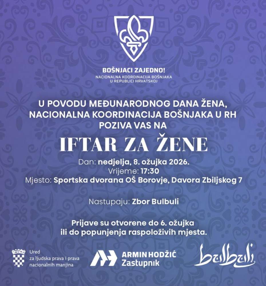 Nacionalna koordinacija Bošnjaka u Republici Hrvatskoj povodom Međunarodnog dana žena organizira iftar za žene, koji će se održati u nedjelju, 8. marta 2026. godine, s početkom u 17:30 sati, u Sportskoj dvorani OŠ Borovje, Davora Zbiljskog 7, Zagreb.