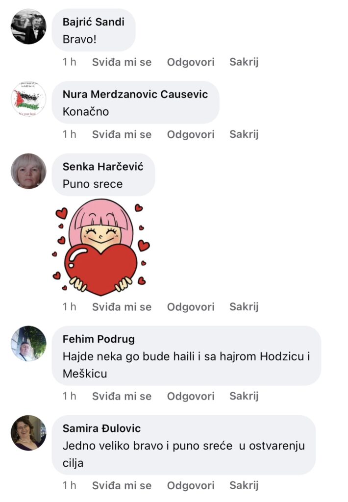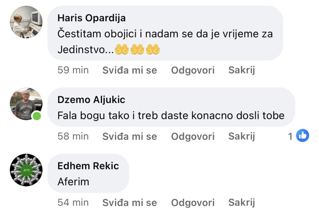 “Jedno veliko bravo i puno sreće u ostvarenju cilja”, “Hvala Bogu, tako i treba”, “Aferim”, “Bravo, sad sigurno izlazim na izbore jer napokon imam za koga glasati” samo su neki od komentara oduševljenih Bošnjaka.
