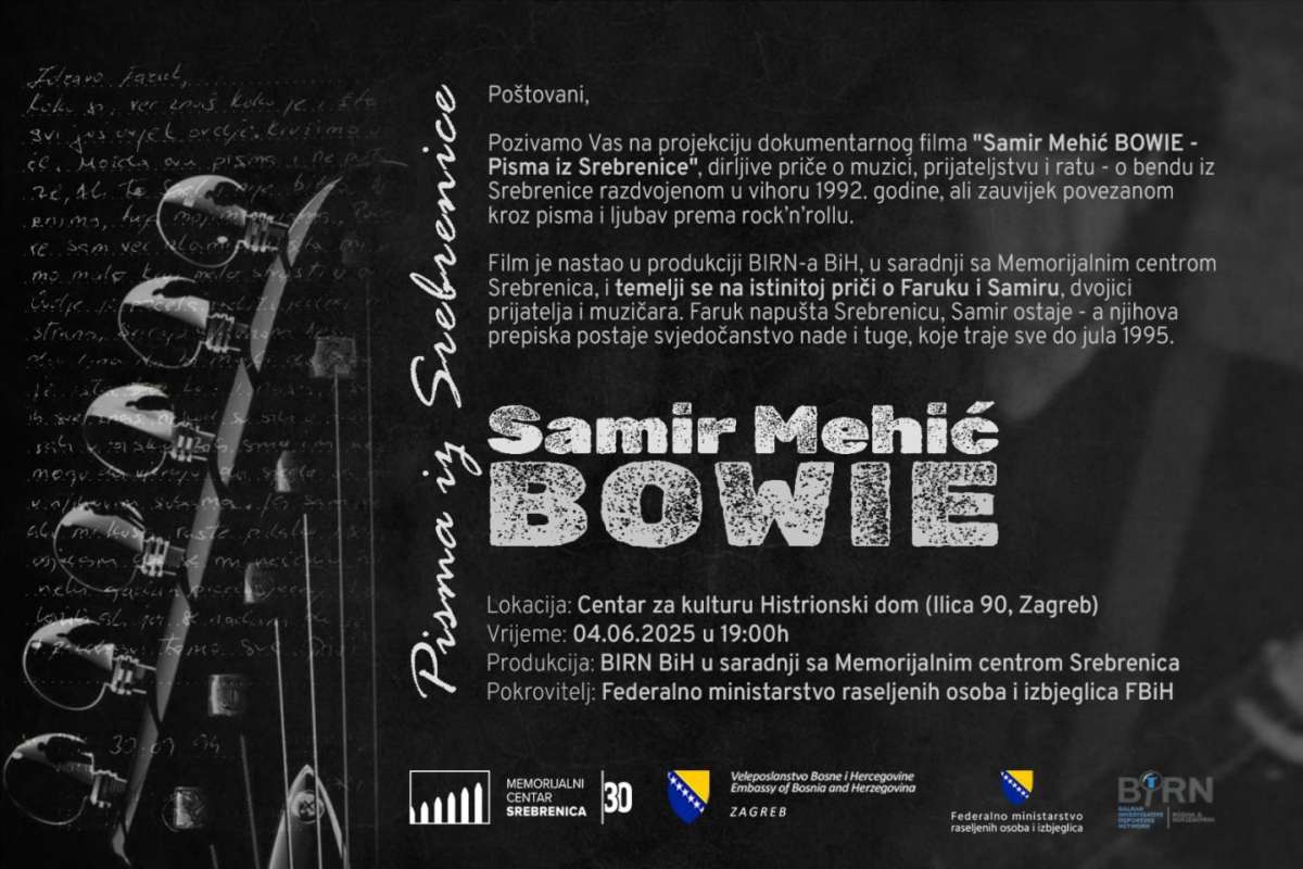 U Centru za kulturu Histrionski dom u Zagrebu, 4. juna s početkom u 19 sati, bit će prikazan dokumentarni film “Samir Mehić BOWIE – Pisma iz Srebrenice”, potresna priča o muzici, prijateljstvu i ratu. Film donosi autentično svjedočanstvo o dvojici mladića, Samiru i Faruku, koje je vihor rata 1992. godine razdvojio, ali čija je veza opstala kroz pisma i zajedničku ljubav prema rock'n'rollu.