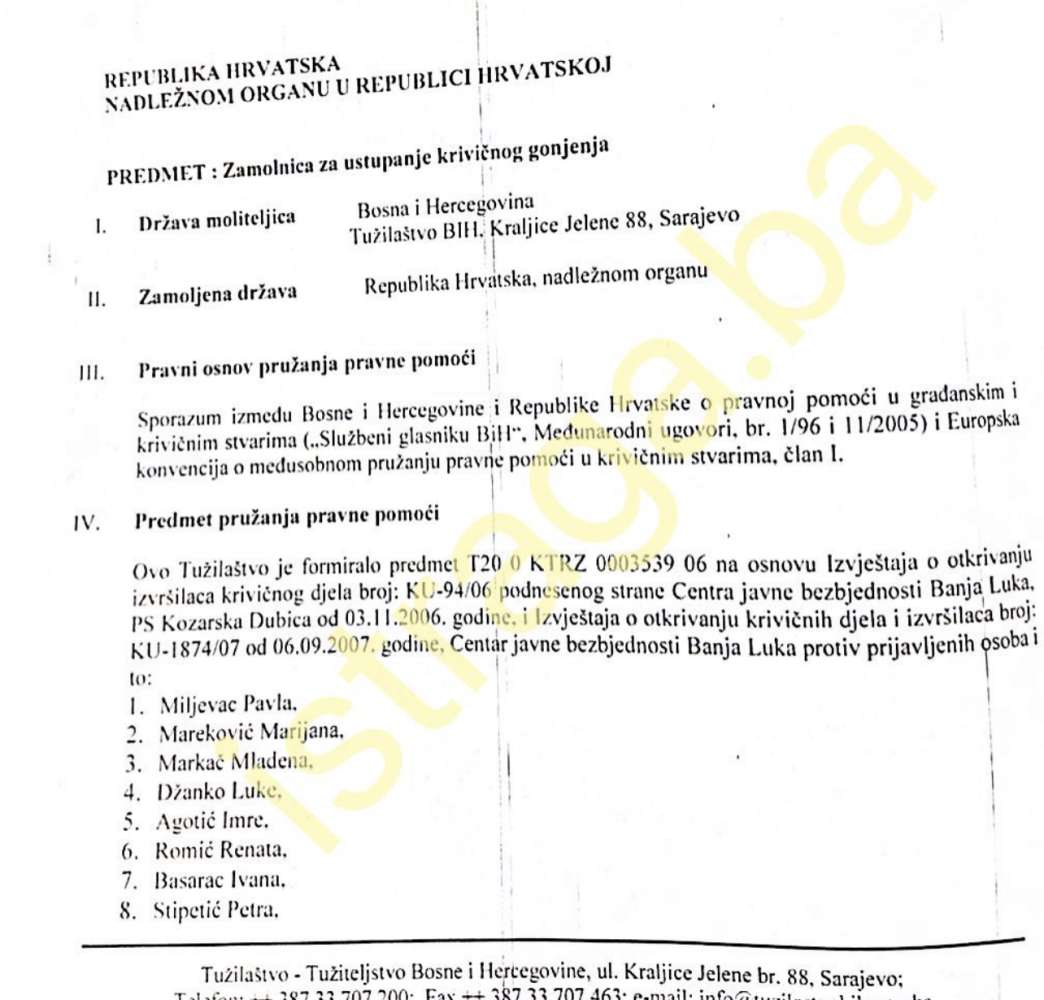 “Ovo Tužilaštvo formiralo je predmet T20 KTRZ 0003539 06 na osnovu Izvještaja o otkrivanju izvršilaca krivičnog djela broj: KU – 94/06 podnesenog od strane Centra javne bezbjednosti Banja Luka, PS Kozarska Dubica od 3. 11. 2006. godine i Izvještaja o otkrivanju krivičnih djela i izvršilaca broj KU-1874/07 od 6.9. 2007. godine, Centar javne bezbjednosti Banja Luka protiv prijavljenih osoba i to: Pavla Miljevca, Marijana Marekovića ….” navedeno je u zamolnici Tužilaštva BiH dostavljenoj hrvatskim vlastima nakon čega su brojni zvaničnici iz Hrvatske saopćili da se radi o pritisku “političkog Sarajeva”.