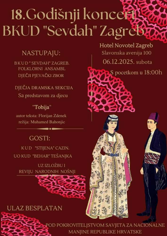 Bošnjačko kulturno-umjetničko društvo “Sevdah” Zagreb najavljuje svoj 18. godišnji koncert, koji će biti održan u subotu, 6. decembra 2025. godine, s početkom u 18 sati, u Hotelu Novotel Zagreb (Slavonska avenija 100).