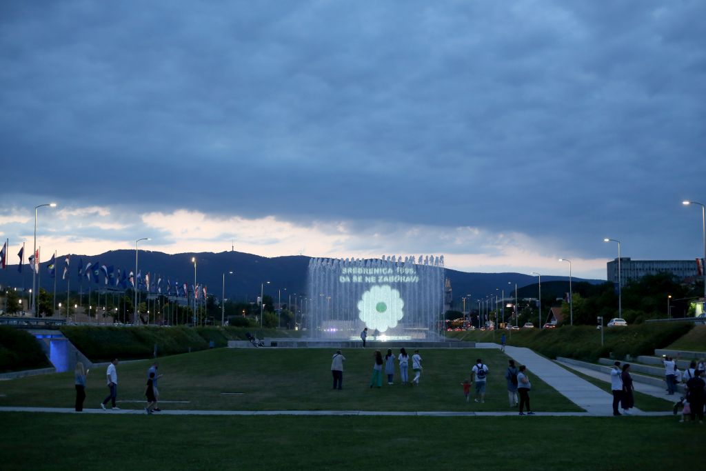 - Zagreb, Hrvatska – 10. srpnja 2021: Vijeće bošnjačke nacionalne manjine Grada Zagreba (VBNMGZ) program obilježavanja 26. godišnjice genocida u Srebrenici završava svjetlosnom projekcijom cvijeta „Sjećanje“ na Zagrebačkim fontanama u Ulici Hrvatske bratske zajednice ( Stipe Majic – Anadolu Agency )