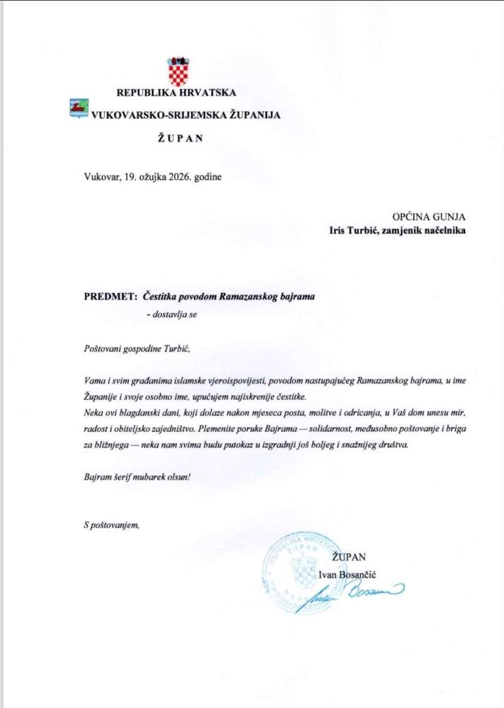 U poruci upućenoj Irisu Turbiću, zamjeniku načelnika Općine Gunja, župan Bosančić je u ime Županije i svoje osobno ime izrazio najiskrenije čestitke vjernicima koji su protekli mjesec proveli u postu, molitvi i odricanju. Župan je naglasio kako plemenite poruke Bajrama, poput solidarnosti, međusobnog poštovanja i brige za bližnje, ne smiju ostati samo unutar blagdanskih okvira, već trebaju služiti kao trajni putokaz cijeloj zajednici.